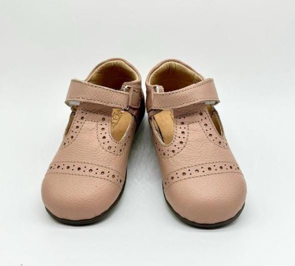 Son en cuero natural 100% tienen la punta redonda para que sus deditos estén holgados, suelita en TR "NO RESBALA" es plana y muy flexible lo cual les ayuda a mantener el equilibrio, también muy liviana para que no tengan cargas innecesarias.